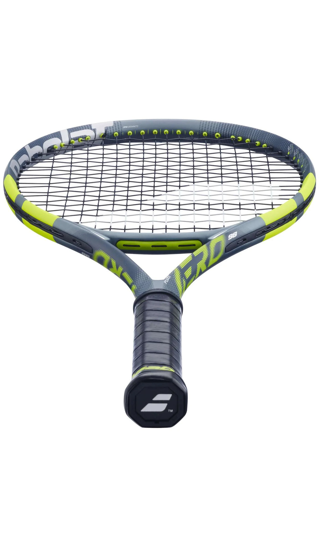 The frame also features the latest NF²-Tech dampening system, using strategically positioned flax fibres to filter vibration and produce a softer, more arm-friendly impact feel. As with the previous generation, the Pure Aero 98 retains FSI Spin Technology, combining Babolat’s proven Woofer system with dedicated Spin Grommets to increase string movement and dwell time for enhanced spin production and a more responsive feel on angled or off-centre contact.